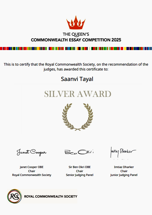 We are delighted to share that, on the recommendation of the judges, Saanvi Tayal has been awarded a Silver Award in The Queen’s Commonwealth Essay Competition 2025 by the Royal Commonwealth Society (certificate attached). With a record 53,434 entries received this year from across the 56 Commonwealth member countries, this recognition is especially meaningful to us and a proud moment for the school community as well.