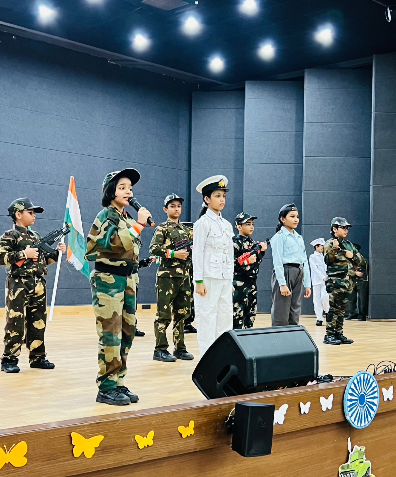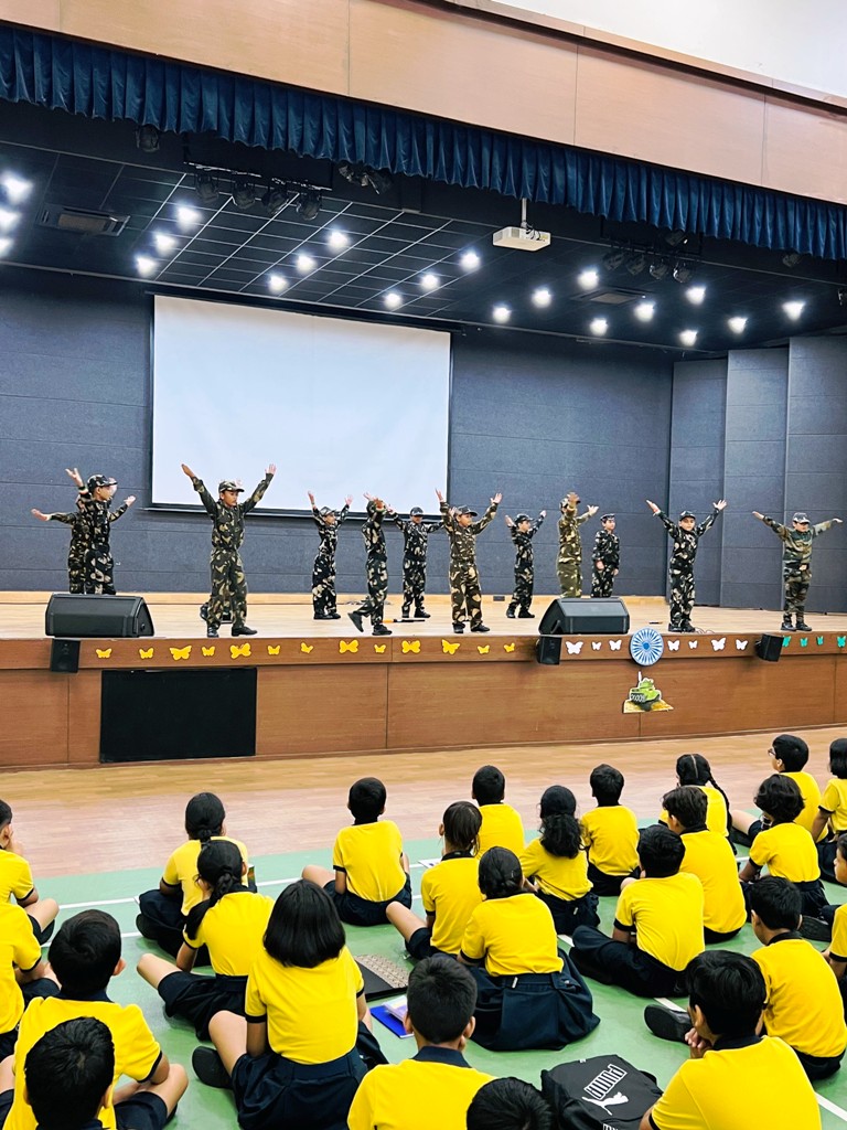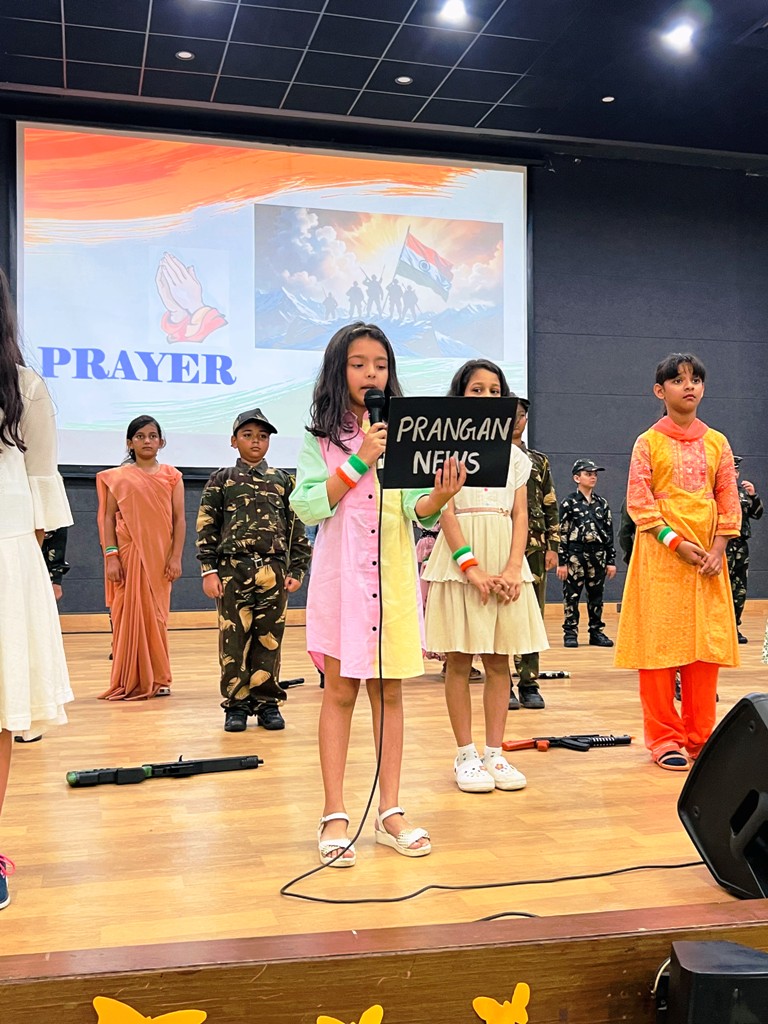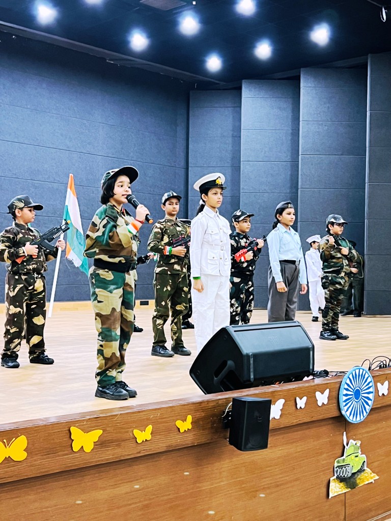 The assembly also featured few students dressed as the chiefs of the Indian Army, Navy, and Air Force, urging everyone to respect and support the defense forces. Role of women officers in defence forces was also depicted effortlessly. They reminded us of the immense sacrifices made by our soldiers. The assembly concluded with a prayer for global peace, understanding, and the well-being of our nation. It was a heart-touching and well-executed performance by the students.