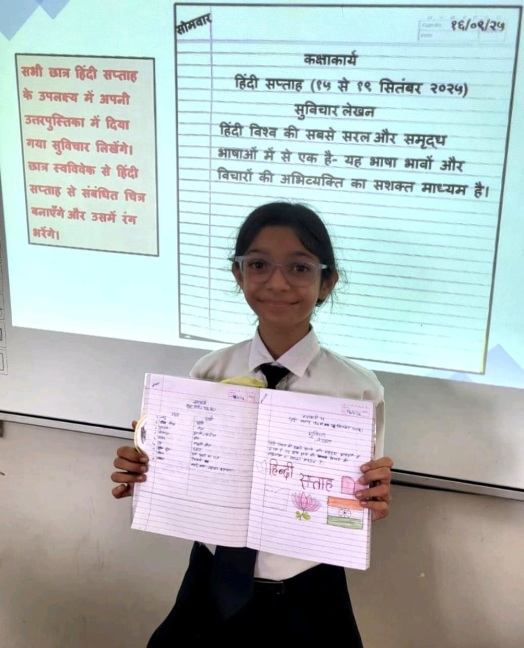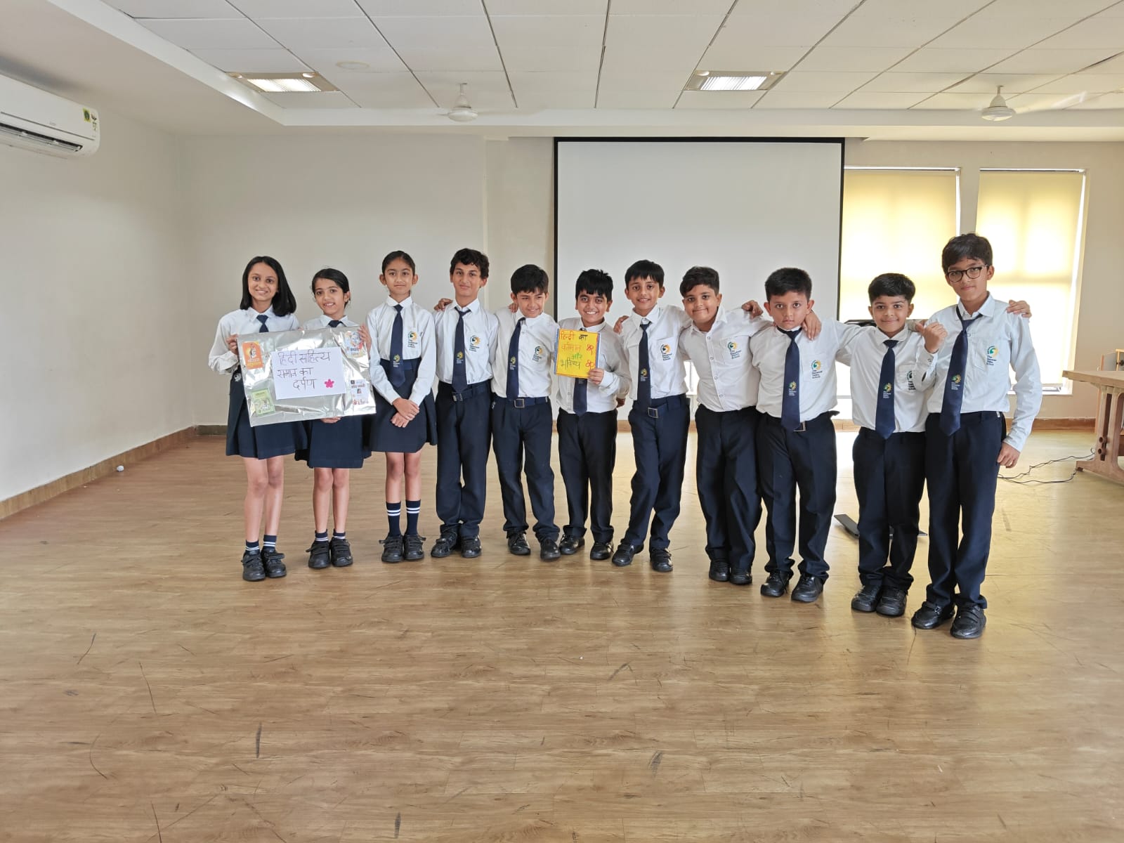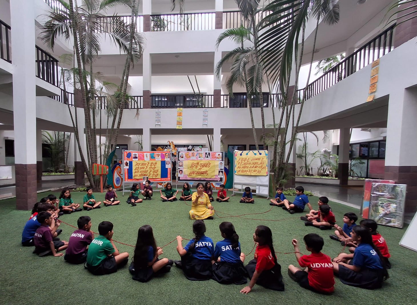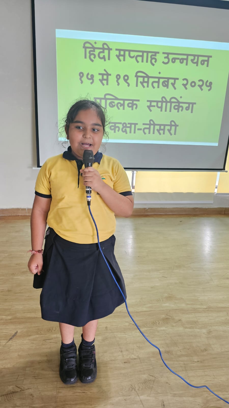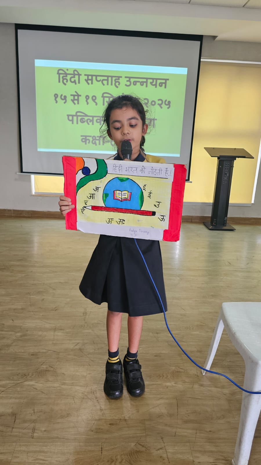 राजभाषा हिंदी के गौरव-गान को जन-जन की चेतना में प्रवाहित करने के लघु-प्रयास के अंतर्गत हिंदी विभाग प्रांगण द्वारा हिंदी भाषा के लिए विविध गतिविधियों का आयोजन किया गया। इस आयोजन के अंतर्गत छात्रों के लिए हिंदी पखवाड़े से संबंधित विशेष अभ्यास पत्रक, कविता प्रस्तुतीकरण (कक्षा चौथी-समय बहुत ही मूल्यवान है एवं कक्षा पाँचवीं-कोशिश करने वालों की कभी हार नहीं होती), आज का प्रश्न, आओ बुनें कहानी, हिंदी भाषा में पब्लिक स्पीकिंग आदि गतिविधियाँ आयोजित की गईं। इन गतिविधियों को संचालित करने का उद्देश्य था, छात्रों के हृदय में राजभाषा के प्रति गौरव के भाव एवं भाषा सीखने की रुचि जाग्रत करना। छात्रों द्वारा उत्साहपूर्वक सभी गतिविधियों में प्रतिभागिता करना इस बात का द्योतक है कि सभी गतिविधियाँ रुचिकर थीं, भली-भाँति सम्पन्न हुईं, आयोजन सफल रहा।