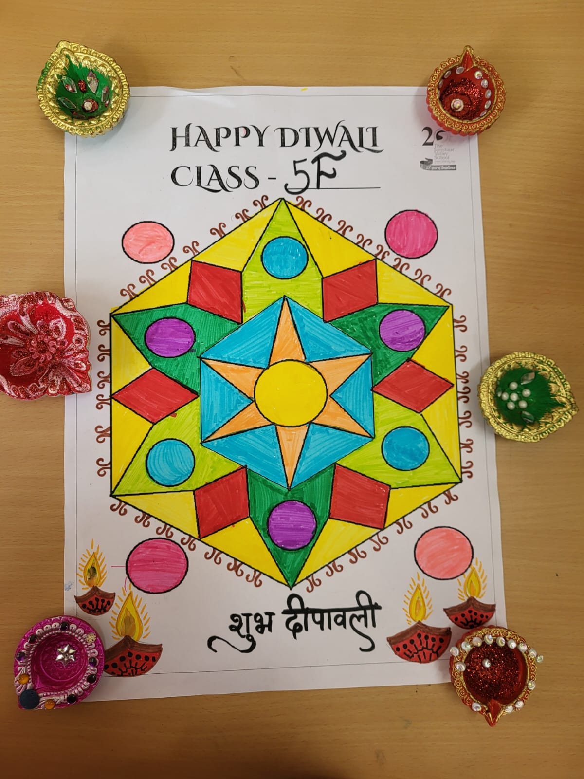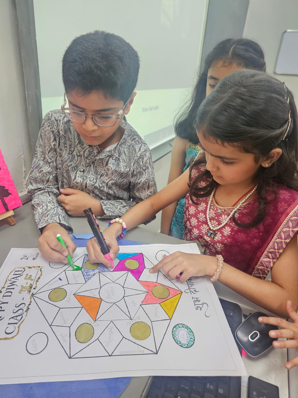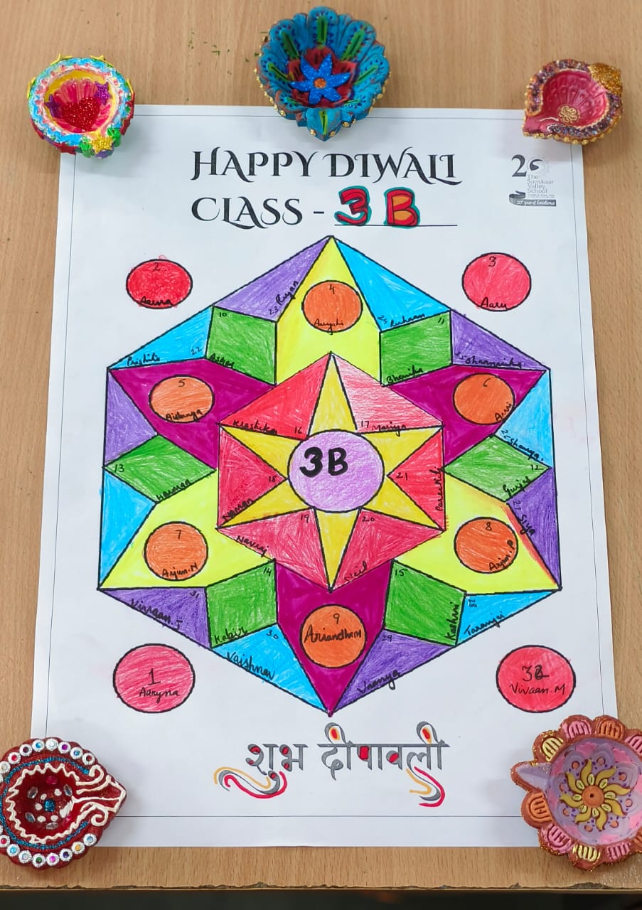 The celebration began with Rangoli Activity, where each class collaboratively coloured parts of a rangoli design on an A3 sheet. As every child added colour to their part, the pieces came together to form a vibrant Class Paper Rangoli, symbolizing unity and teamwork. The activity concluded with cheerful class photographs taken in the Prangan courtyard to capture these beautiful festive moments.