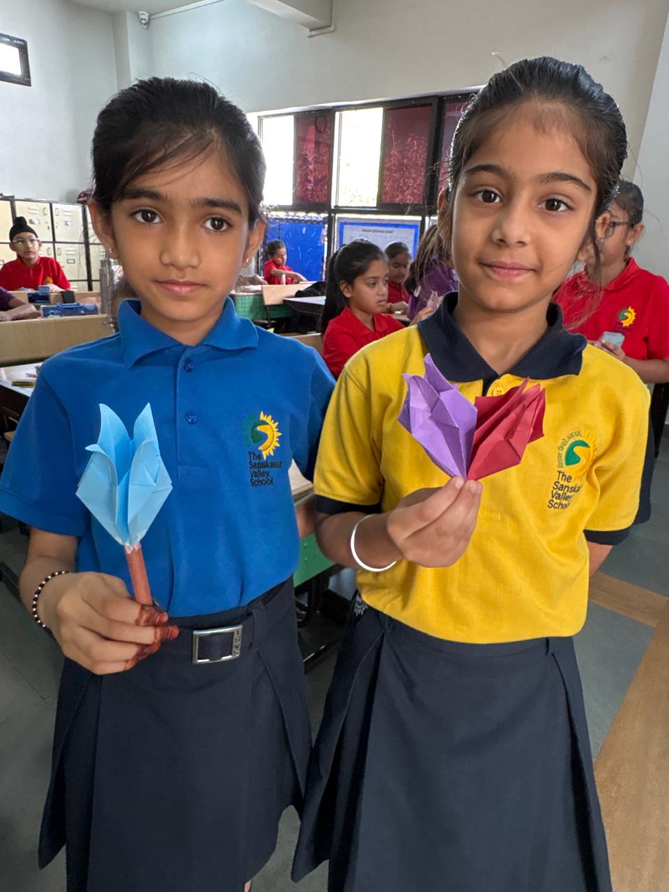 The craft activity for Grade IV students was conducted with great enthusiasm and creativity. The objective of the activity was to provide students with an opportunity to apply the origami skills they had learnt in their regular classes in an innovative and meaningful way. With keen interest and excitement, the students used folded paper forms to create imaginative and attractive compositions.