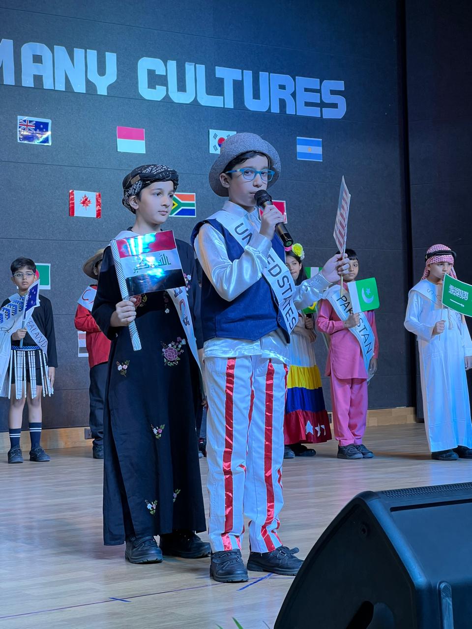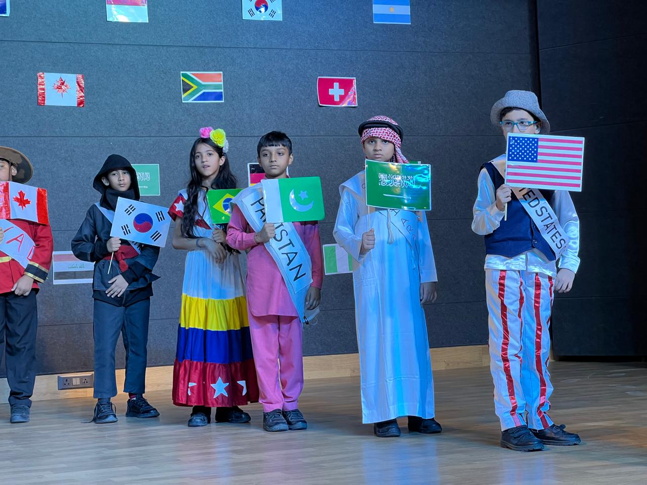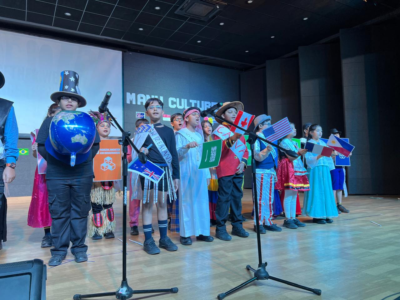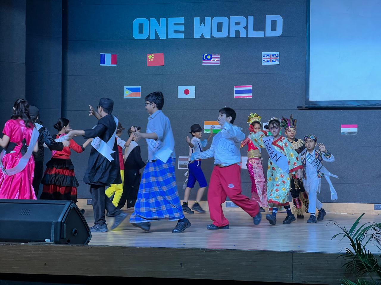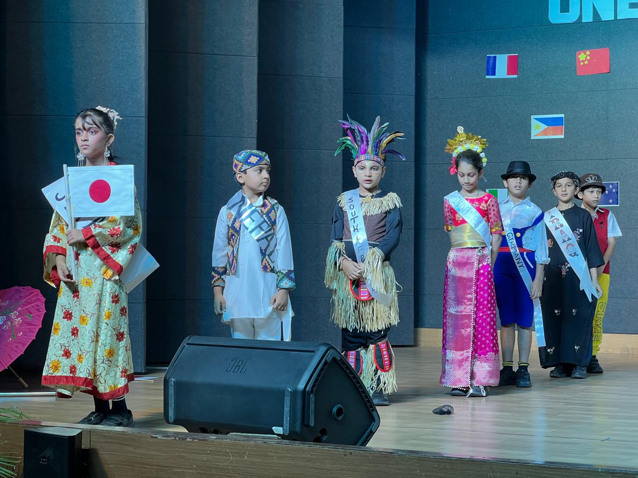 The Class Assembly on the theme “One World, Many Cultures” was eloquently presented by Grade 5A, reflecting a harmonious blend of creativity, awareness, and global perspective. The assembly commenced with a vibrant cultural tableau, where students, adorned in traditional attire and carrying national flags, represented diverse nations, celebrating the richness of global heritage.
