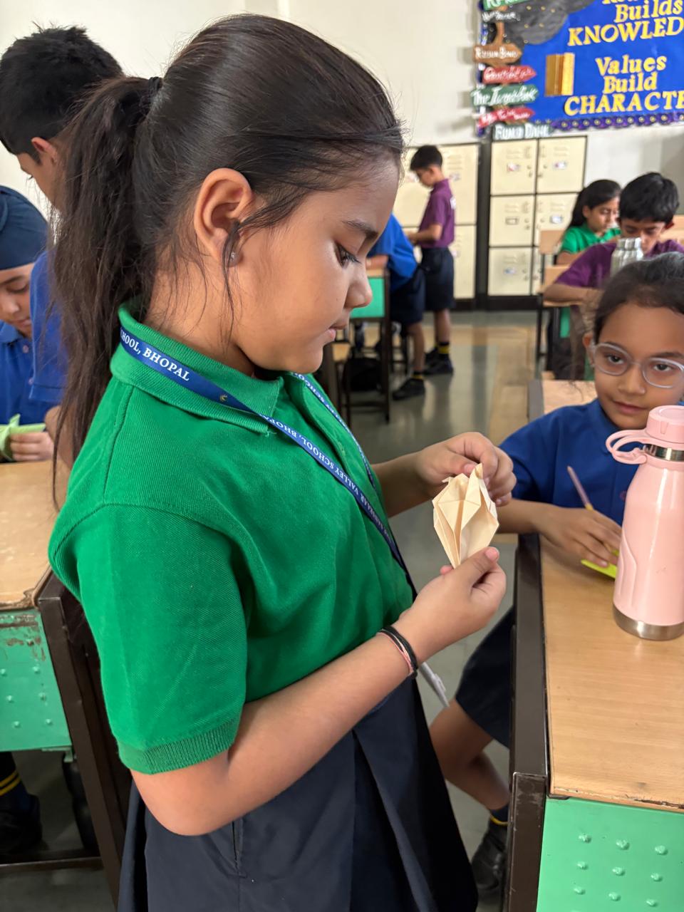 The craft activity for Grade IV students was conducted with great enthusiasm and creativity. The objective of the activity was to provide students with an opportunity to apply the origami skills they had learnt in their regular classes in an innovative and meaningful way. With keen interest and excitement, the students used folded paper forms to create imaginative and attractive compositions.