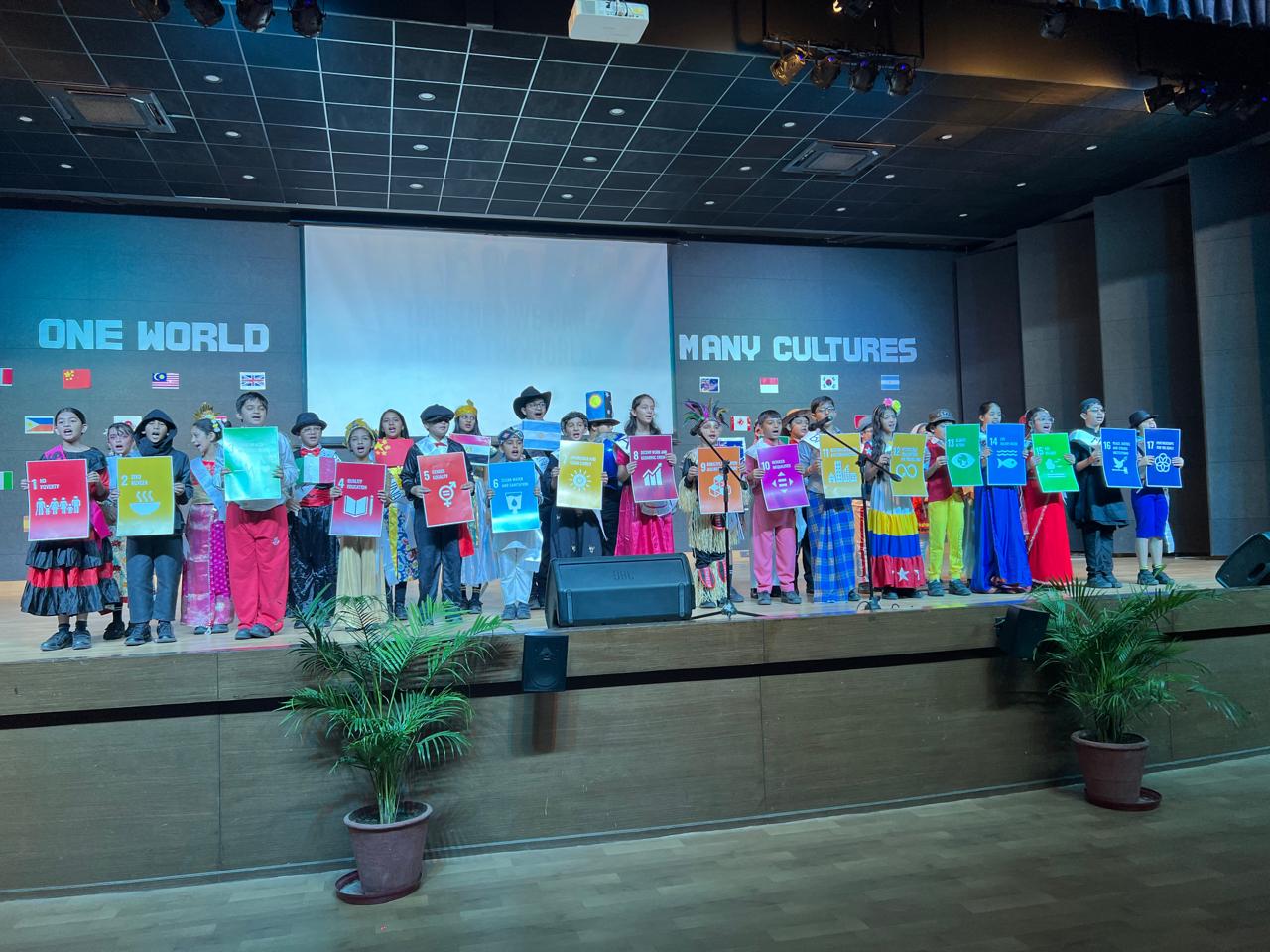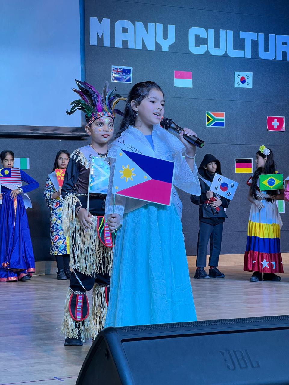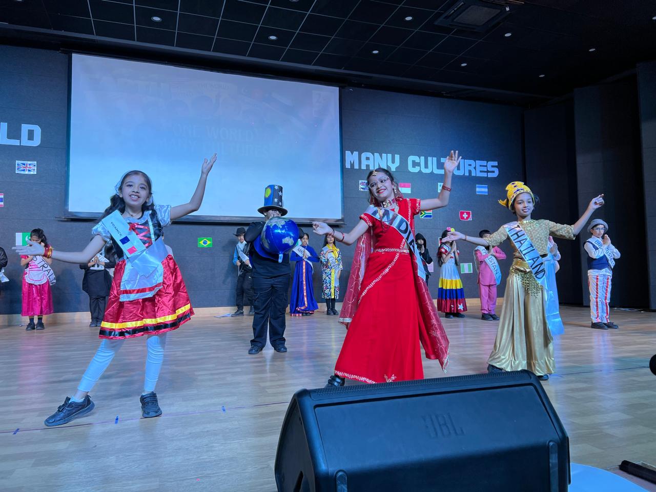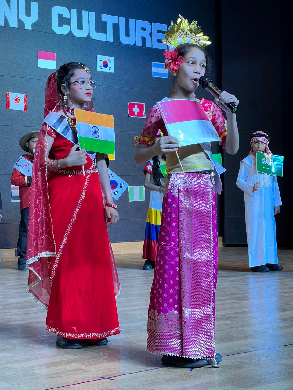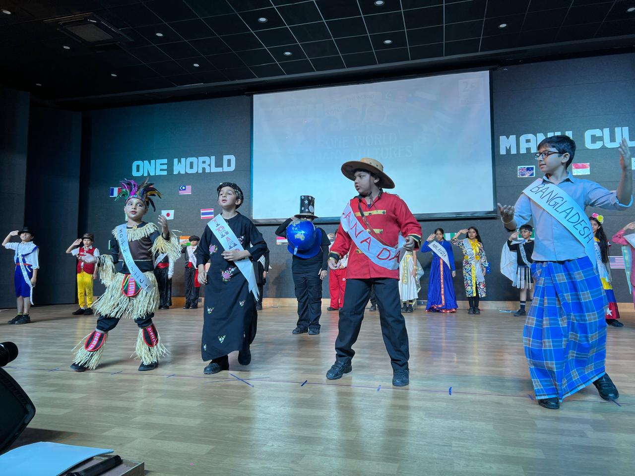 The Class Assembly on the theme “One World, Many Cultures” was eloquently presented by Grade 5A, reflecting a harmonious blend of creativity, awareness, and global perspective. The assembly commenced with a vibrant cultural tableau, where students, adorned in traditional attire and carrying national flags, represented diverse nations, celebrating the richness of global heritage.