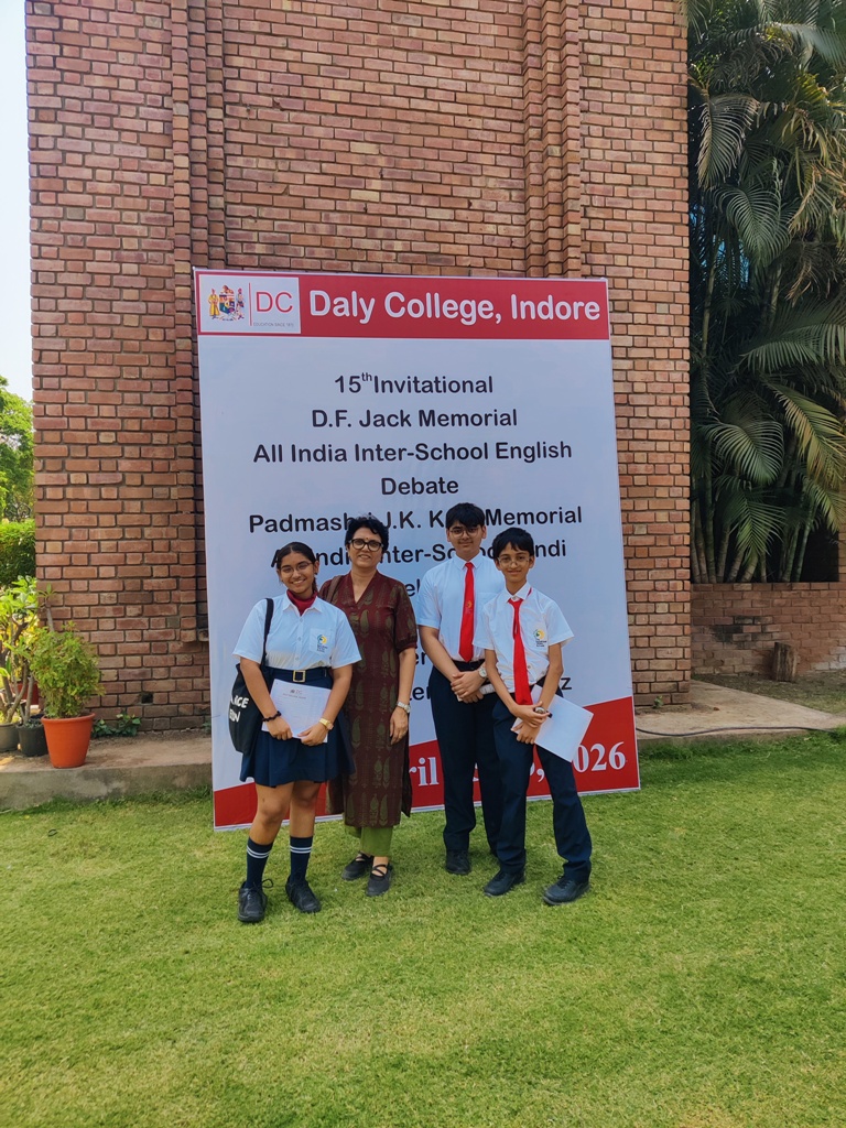 The team from The Sanskaar Valley School, Bhopal, participated in the prestigious DF Jack Memorial English Debate held at Daly College, Indore from 25th to 26th April 2026. Representing the school were Aarav Anand [10 IG], Raywa Saboo [9F], and Arham Jain [9F], who demonstrated confidence, adaptability, and strong oratory skills throughout the competition.